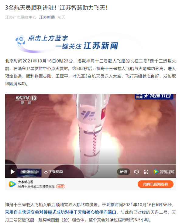 江苏卫视:“神十三”成功飞天,看江苏力量助力中国“神舟”再会“天河”!
