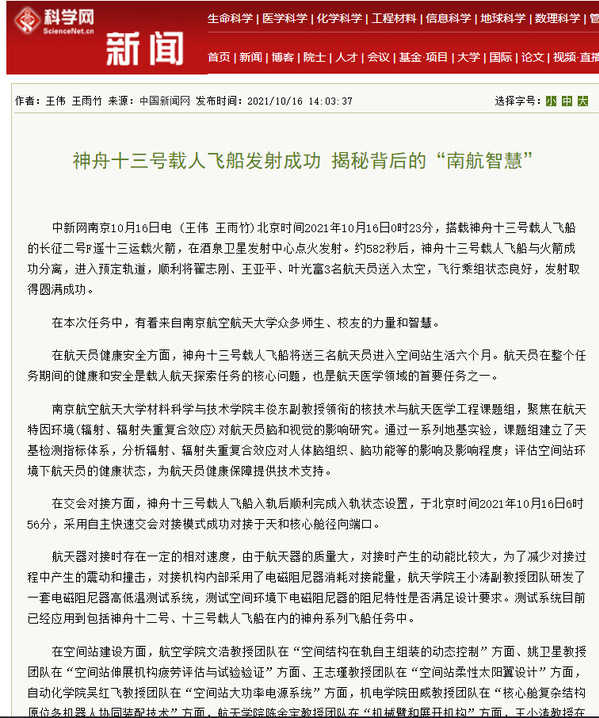 中国科学网:神舟十三号载人飞船发射成功 揭秘背后的“南航智慧”