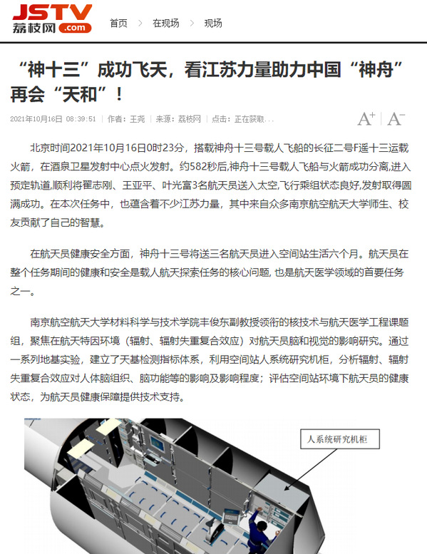 现代快报:神十三航天员“太空出差”如何保障健康?南航科研团队解难题