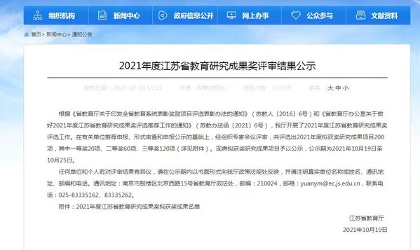 省教育厅为更好地调动全省教育系统广大教师和科研工作者开展科研创新和推动科技进步的积极性,促进产出高质量的教育研究成果,不断提升江苏教育系统科学研究的学术影响力,设立了江苏省教育科学研究成果奖,包括高校科学技术研究成果奖、高校哲学社会科学研究成果奖、教育研究成果奖三个类别,每两年评选表彰一次。今年的教育研究成果奖在单位推荐申报、形式审查和申报公示的基础上,经组织专家会议评审,共评选出获奖研究成果项目200项,其中一等奖20项、二等奖60项、三等奖120项。