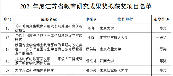 近日,江苏省教育厅公布了2021年度江苏省教育研究成果奖的评审结果。我校党委常委、宣传部/教师工作部部长王晖的专著《当代中国高等学校学生工作创新发展与实践研究》获一等奖,外国语学院谢小苑教授的专著《大学英语新课程体系探索》获二等奖。