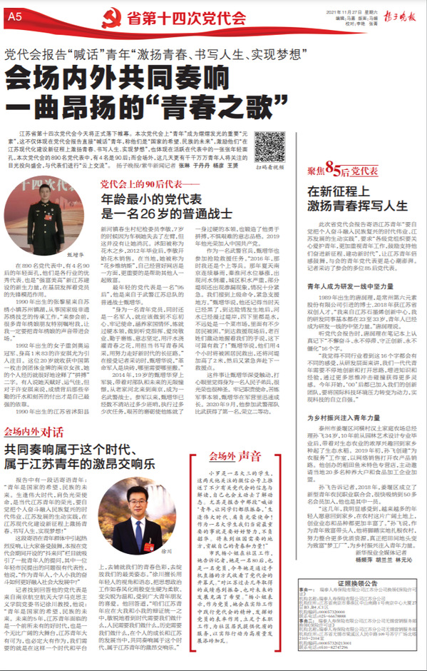 徐川在接受媒体采访时表示,大会报告中特别关注了青年群体,体现了江苏对青年的殷切期待,希望未来五年江苏青年能够在这片大地上呈现风采和力量。“咱们江苏青年应在大我和小我的辩证统一之中,敏锐地看到时代需要我们做什么,人民需要我们做什么,历史需要我们做什么,在个人的成长和江苏的发展当中,共同奏响属于这个时代、属于江苏青年的激昂交响乐。”