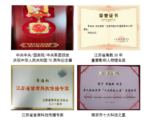 多年的无私付出和奉献,让他荣获了“中国航空学会杰出贡献奖”、中共中央/国务院/中央军委颁发的国庆70周年纪念章、“江苏省高教30年重要影响人物提名奖”、“江苏省首席科技传播专家”、“南京市十大科技之星”等荣誉。