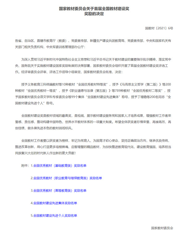 首届教材建设奖评选,是新中国成立以来首次设立全面覆盖教材建设各领域的专门奖励项目,由国家教材委员会主办,每四年评选一次,旨在总结展示党的十八大以来教材建设的重大成就,对各级各类优秀教材和作出突出贡献的先进集体、先进个人予以表彰。全国教材建设奖是教材领域的最高奖项,是检阅、展示教材建设服务党和国家人才培养成果,增强教材工作者荣誉感、责任感,推动构建中国特色、世界水平教材体系的一项重大制度。