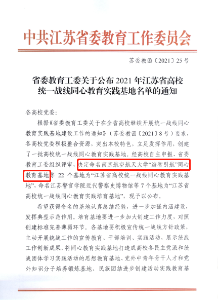 近日,“江苏省高校统一战线同心教育实践基地”名单公布,我校“海智引航”同心教育基地成功入选。