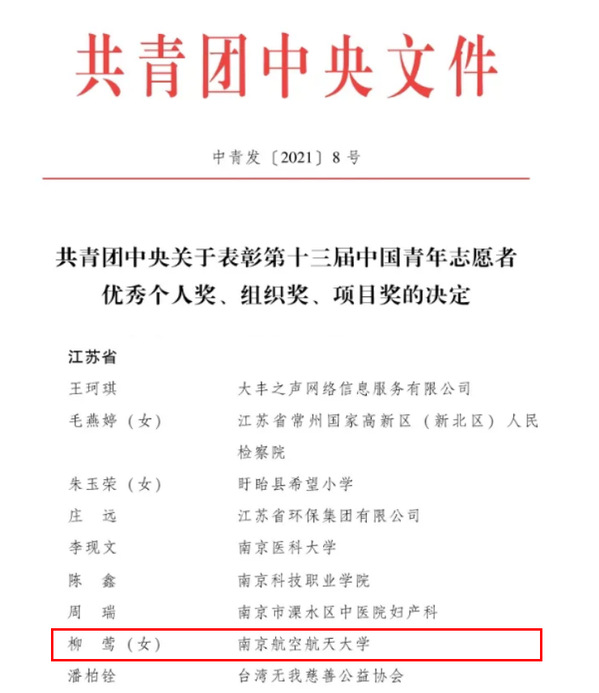 据悉,“中国青年志愿者优秀个人奖”每两年评选一次,是我国青年志愿服务领域的最高荣誉。本届评选活动注重面向社会基层和一线选树先进典型,注重对重大事件、重点领域中表现突出的个人进行激励,共选拔出258名“中国青年志愿者优秀个人奖”,展示新时代青年志愿者的理想信念、爱心善意、责任担当,引导广大团员青年在新时代新征程上奋勇建功立业。