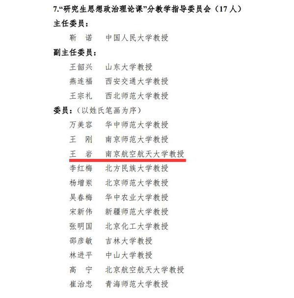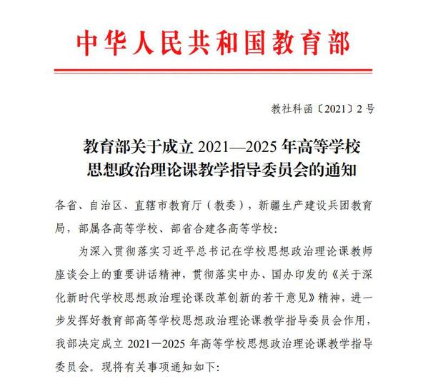 近日,《教育部关于成立 2021—2025 年高等学校思想政治理论课教学指导委员会的通知》公布,我校马克思主义学院2位专家入选。王岩教授入选“研究生思想政治理论课”分教学指导委员会委员,何畏教授入选“毛泽东思想和中国特色社会主义理论体系概论”分教学指导委员会委员。