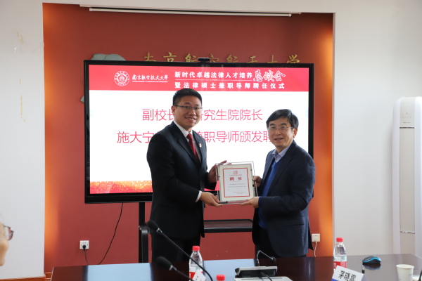 12月4日上午,南京航空航天大学人文与社会科学学院新时代卓越法律人才培养恳谈会暨兼职导师聘任仪式在我校顺利举行。来自江苏省高级人民法院、江苏省纪委监委、南京市中级人民法院、南京市人民检察院、南京市司法局、江宁经济技术开发区人民法院、江宁经济技术开发区人民检察院、玄武区人民法院、玄武区人民检察院、鼓楼区人民检察院和江苏天煦律师事务所的21位新聘兼职导师参加,副校长施大宁,研究生院常务副院长徐正扬,人文学院党委书记楚广兴、院长高志宏、副书记尹春苹、副院长茅晓嵩参加会议。会议由高志宏主持。