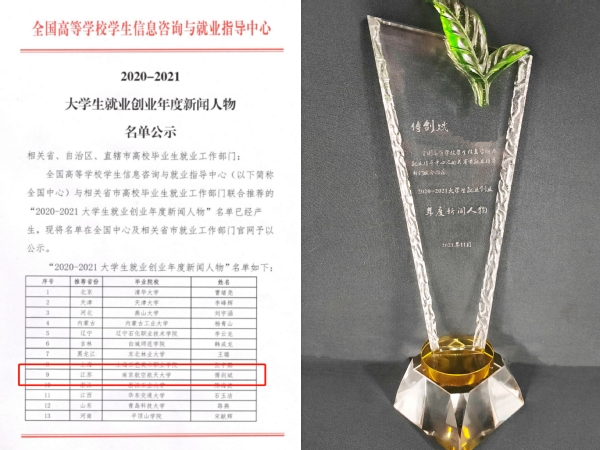 近日,全国高等学校学生信息咨询与就业指导中心公布了“2020-2021大学生就业创业年度新闻人物”评选结果,来自全国25个省(自治区、直辖市)的25名毕业生入选,我校电子信息与工程学院/集成电路学院2021届博士毕业生傅剑斌成为江苏省唯一一名获此殊荣的高校毕业生。