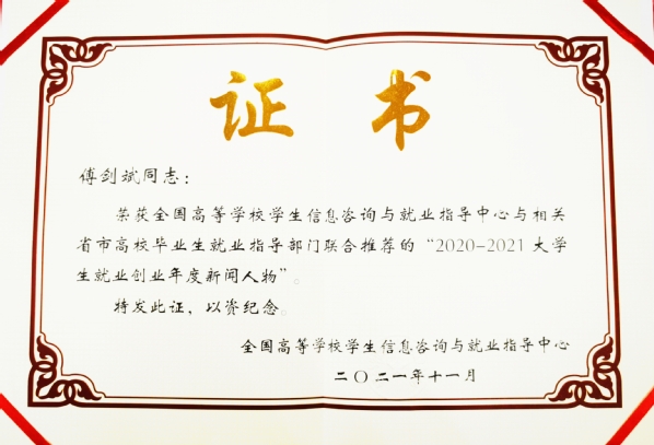 本次评选由教育部全国高等学校学生信息咨询与就业指导中心主办,各省市高校毕业生就业指导部门联合推荐,旨在宣传基层就业、征兵入伍、创新创业方面有突出成绩和示范作用的优秀大学毕业生典型事迹。傅剑斌作为我校培养孵化的创新创业代表,经过学院典型申报、学校组织推荐、江苏省教育厅遴选上报,最终成功入选全国年度人物,这是对学校人才培养质量的肯定,也是南航学子矢志一流、奋斗报国风采的最好展现。