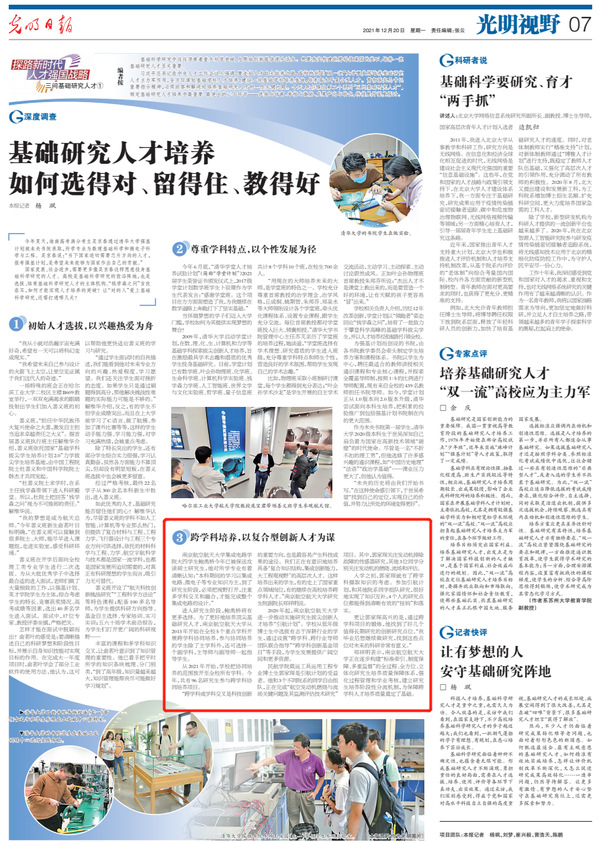 编者按:12月20日,《光明日报》光明视野版面开展系列深度调查内容,推出专题报道《基础研究人才培养 如何选得对、留得住、教得好》,对基础研究人才的选育、考核、激励、成果产出与转化持续展开深度探讨,就相关问题对清华大学、哈尔滨工业大学、南京航空航天大学三所高校进行深度采访,现转发文章如下: