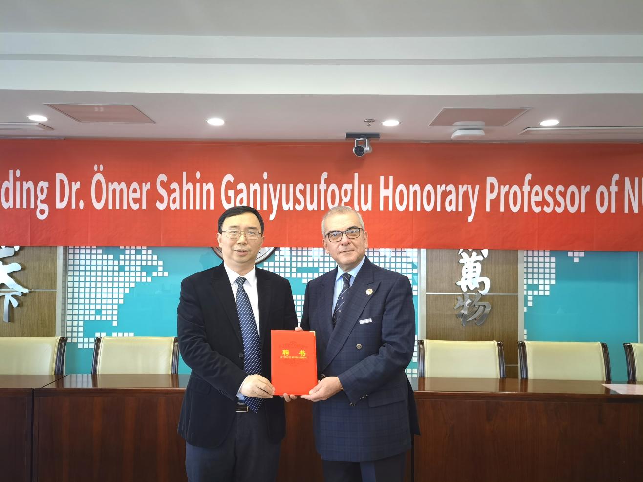 随后,姜斌代表学校为Ganiyusufoglu教授颁发了荣誉教授聘书,并为其佩戴校徽。