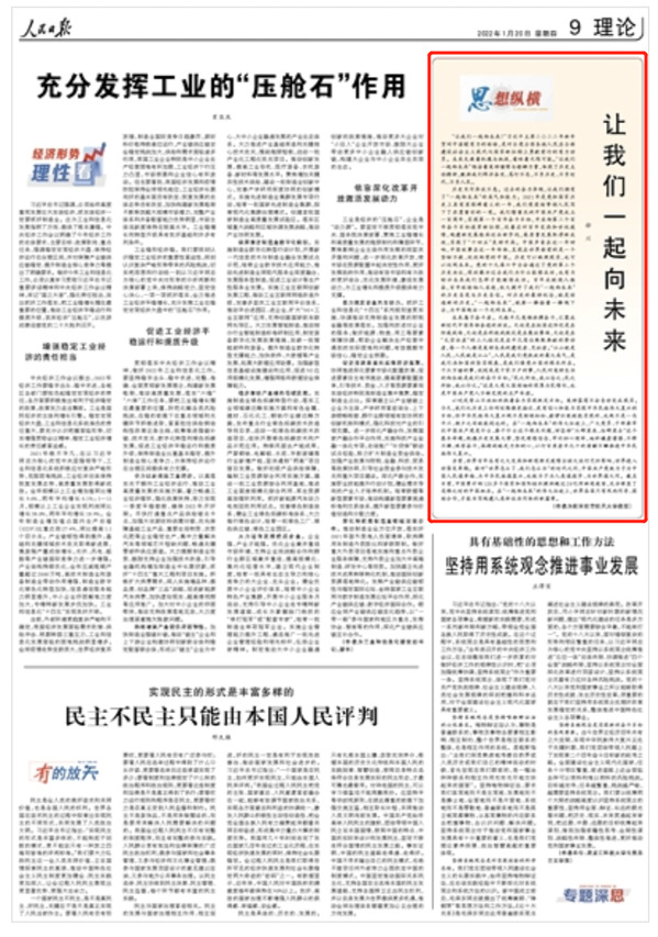 编者按:1月20日出版的《人民日报》第9版“思想纵横”栏目刊登了我校马克思主义学院党委书记徐川教授的理论文章《让我们一起向未来》,现将全文转发如下: