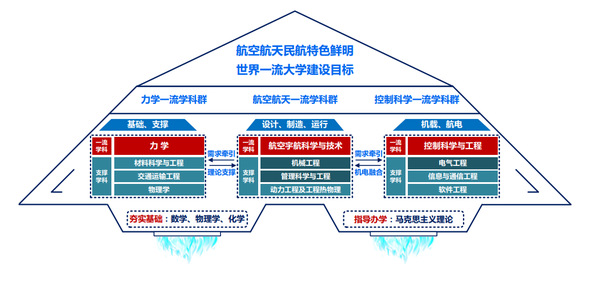 学校第二轮《“双一流”建设高校整体建设方案》与《“十四五”事业发展规划》紧密结合,锚定“三航”特色鲜明的世界一流大学建设目标,瞄准“四个面向”,服务国家航空、航天、民航领域重大需求与制造强国、网络强国建设,聚焦直升机、无人机、发动机等国家重大急需,重点建设力学、控制科学与工程、航空宇航科学与技术一流学科群高地,强化学科交叉融合,统筹建设机械工程、电气工程、管理科学与工程等一级学科,大力加强马克思主义理论学科和数学、物理学、化学等基础学科建设,逐步形成航空宇航科学与技术为“主体”,力学、控制科学与工程为“两翼”,主机类、信息类学科融合带动全校整体共同发展的优势学科群体,构建“一流工科、卓越理科、精品文科、特色交叉”的高标准学科布局和学科体系,带动学校人才培养、师资队伍、科学研究、社会服务、国际合作等各项工作开展。
