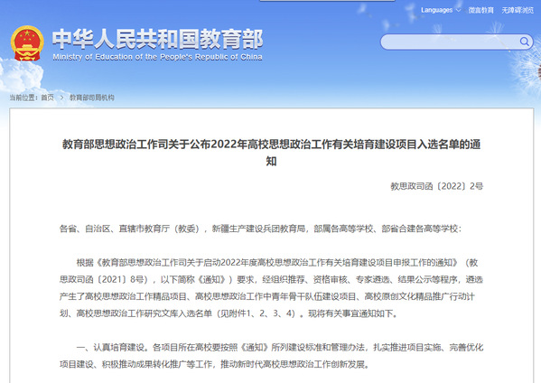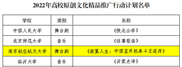 2月24日,教育部发布《教育部思想政治工作司关于公布2022年高校思想政治工作有关培育建设项目入选名单的通知》,我校话剧《旋翼人生:中国直升机泰斗王适存》入选2022年高校原创文化精品推广行动计划,这是继2019年入选中国科协“共和国的脊梁——科学大师名校宣传工程”后,该剧获得的又一国家级荣誉,是我校首次也是江苏省第3个入选该类别的高校原创文化精品项目,标志着我校文化建设成果的新突破。