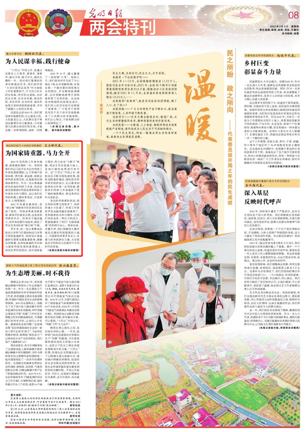 编者按:近日《光明日报》两会特刊刊载全国人大代表、我校航空学院副院长、教授王立峰采访。讲述他在2021“十四五”开局之年,从事的科学研究工作,以及作为一名科技工作者,从党和国家政策中感受到的温暖与关怀。现转发全文报道如下: