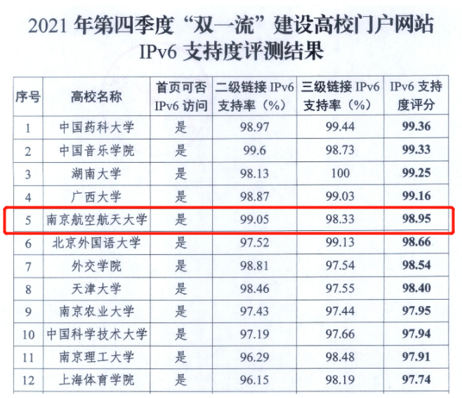 作为入选的唯一一所工信部高校及江苏省高校,这次项目成功落户是对我校IPv6规模部署和特色智慧校园建设工作的充分肯定。同时,在近期教育部公布的“关于‘双一流’建设高校门户网站IPv6支持度测评情况通报”中,我校门户网站IPv6支持度评分为98.95,在137所首批“双一流”高校中排名第5,工信部高校第1。