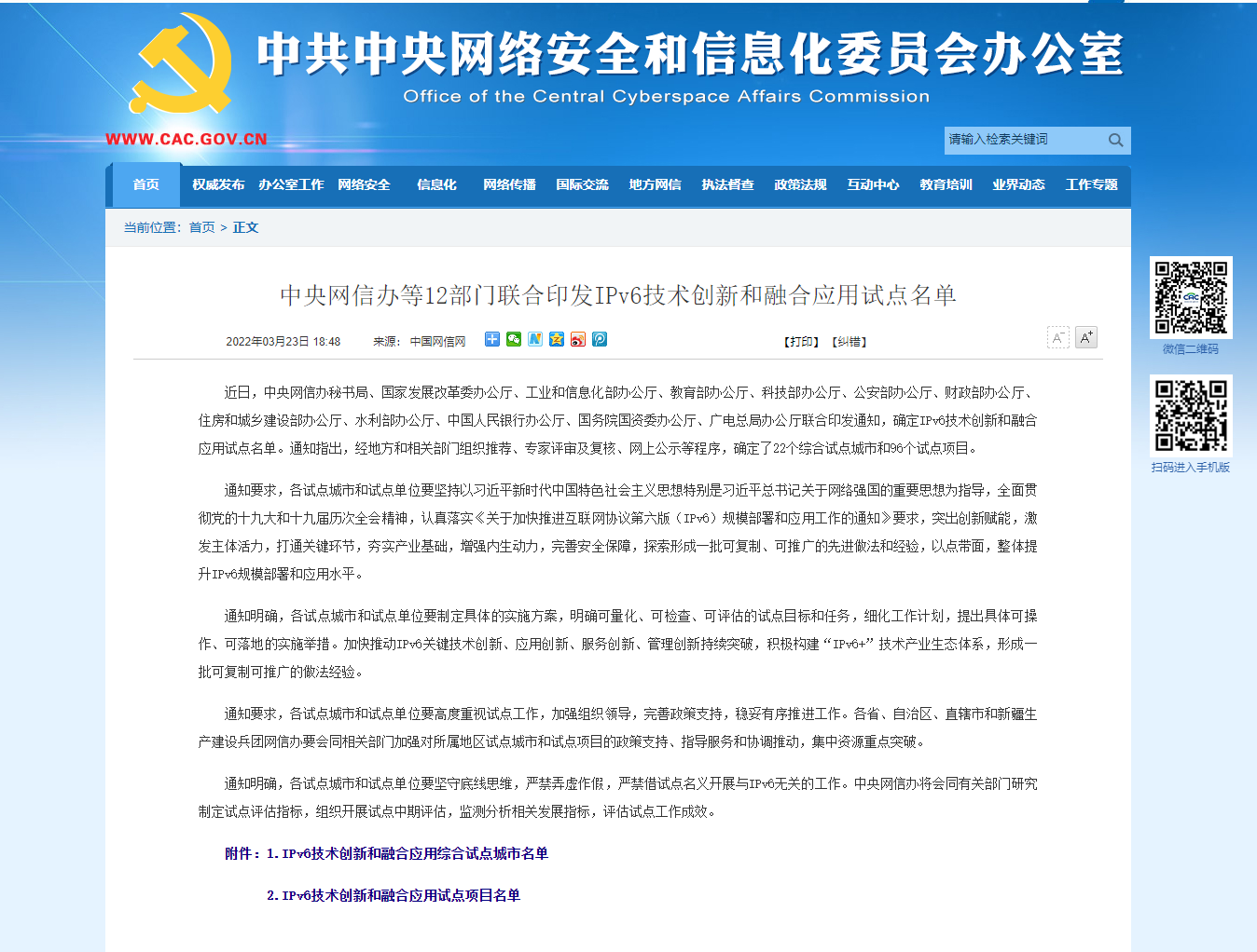 中央网信办等12部门联合印发IPv6技术创新和融合应用试点名单