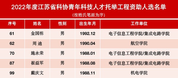 近期,江苏省科协公布了2022年青年人才托举工程入选者名单,我校航空学院周迪,电子信息工程学院/集成电路学院金国栋、施永荣、崔益军,机电学院戴庆文等5名青年教师入选,入选数量位列全省第二位。截止目前,我校已有27名青年教师入选。