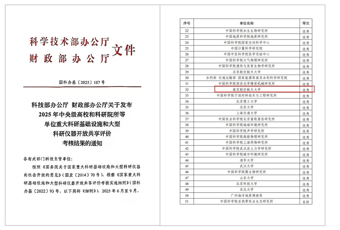 10月10日,科技部、财政部联合发布2025年中央级高校和科研院所等单位重大科研基础设施和大型科研仪器开放共享评价考核结果,我校再获优秀等级,并于“十四五”期间第四次获此佳绩,成为工信部部属高校及江苏省内高校获得优秀等级次数最多的高校之一。本次评价考核共有26个部门344家中央级高校和科研院所参加。